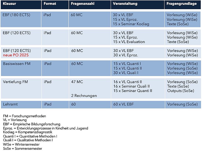 Die Anmelde- und Abmeldefristen sowie Termine der Klausuren der Lehramts- und Bachelorstudiengänge im Fach Empirische Bildungsforschung lauten wie folgt.